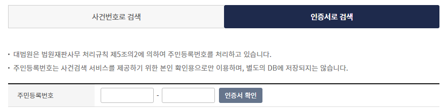 - 사건번호 또는 공동인증서를 이용한 본인 인증 조회